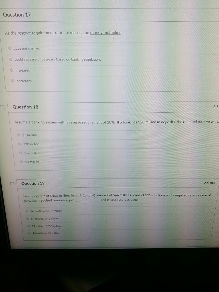 Solved: If The Required Reserve Ratio Is 12.5 Percent, The... | Chegg.com from d2vlcm61l7u1fs.cloudfront.net Basically, an increased ratio requirement results in a lower very simple. Money multiplier is the amount of money that banks generate with each dollar of reserves.reserve is the amount of deposits that the federal reserve require to hold not lend.it is the ratio of stock of money to the stock of high powered money money multiplier=required reserve ratio1. When a central bank increases bank reserves by $1, the money supply rises by more than $1. However the us has no effective reserve requirement at this. When the fed adjusts the reserve requirement, it allows. The borrowed money is deposited into a checking account at another bank that is not any of the previous banks. However, the total quantity of money depends on how often each dollar is used in transactions. This is because the money multiplier formula is calculated as deposits divided by reserve requirement.